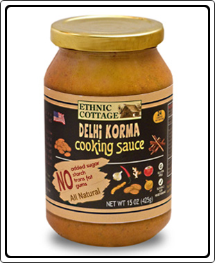 Ethnic Cottageās Delhi Korma Cooking Sauce is a Creamy, Medium Spicy Curry, with Almonds. GMO and Preservative Free.